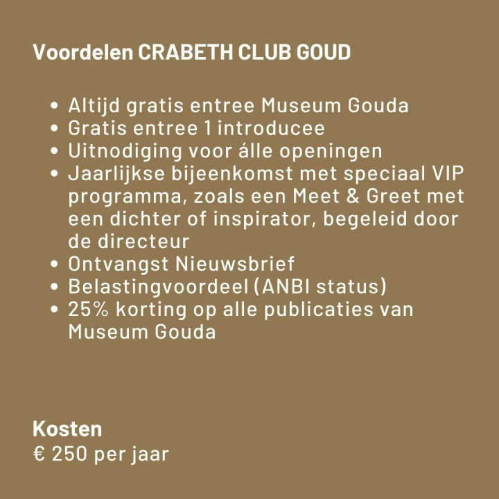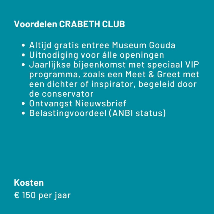 Crabeth Club leden zijn vrienden die het museum financieel nog iets meer steunen, zodat we onze collectie nog beter kunnen presenteren én fraaie tentoonstellingen kunnen maken. Het doel is om zoveel mogelijk mensen naar Gouda te trekken en van museum en stad te laten genieten.